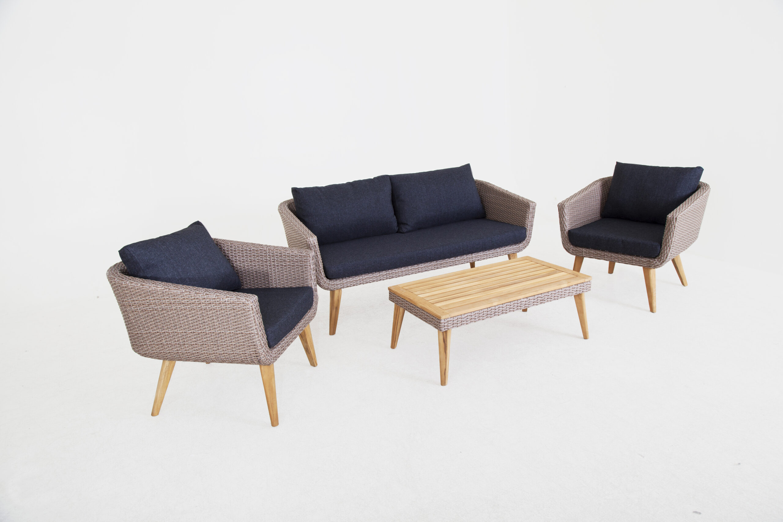 in polirattan, telaio in alluminio, gambe in legno. Completo di cuscini in poliestere 230 g/mq, spessore 10 cmComposto da:divano cm 165x75x74hdue poltrone cm 80x75x74htavolino in legno cm 100x55x38hImballo in cartone unico cm 165x89x64 – Peso 42 kg